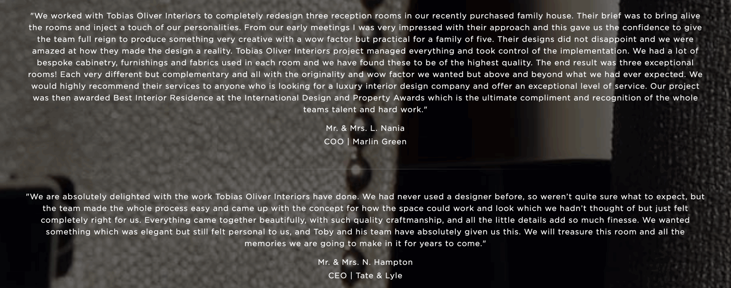 As Interior Design professionals, we work to the high standards set by the British Institute of Interior Design (BIID) and The Society of British Interior Design (SBID). As such, we are subject to their Code of Conduct, in relation to complaints or unacceptable professional conduct or serious professional incompetence. Our contract for Interior Design Services serves as a contract between you (the ‘Client’) and Tobias Oliver Interiors (the ‘Designer’). Our contract has been specifically designed to enable the Client and the Designer to agree the terms and conditions of a contract between them for the provision of interior design services reflecting a reasonable balance of each party’s interest for a project.