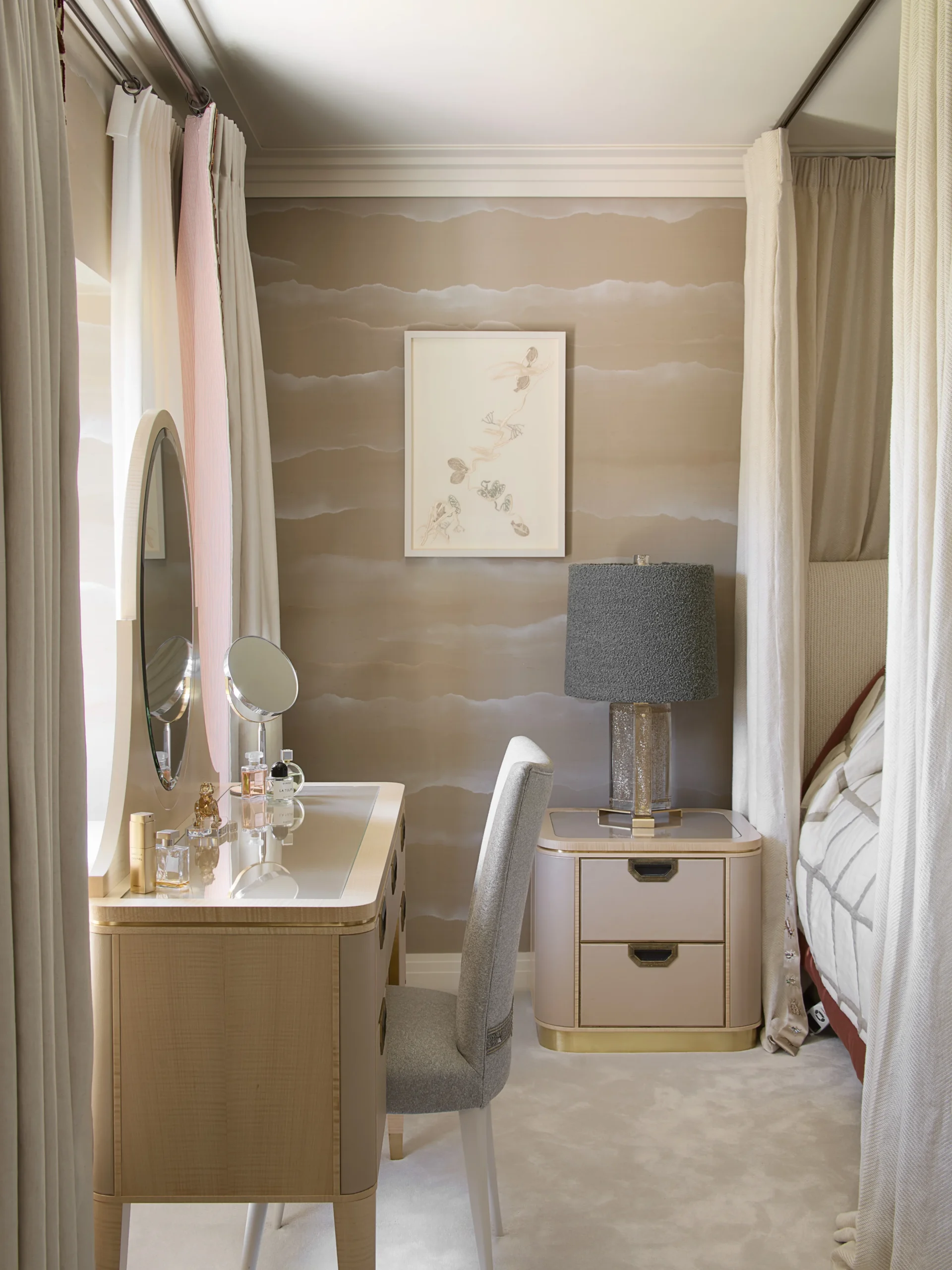 Faced with the constraints of room size and layout, we honed our design expertise to craft an illusion of expansiveness. By seamlessly integrating the kitchen into the walls and employing organic, curved marble forms on the island, we transformed the space into a fluid, inviting environment. A meticulously curated design scheme was also tailored to complement the client’s existing artwork collection, resulting in a harmonious blend of function and artistry.