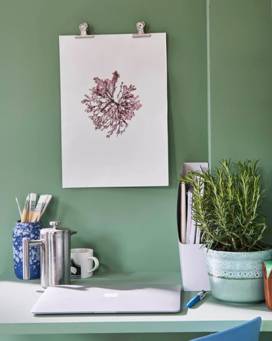 The cheerful paint colour ‘Breakfast Room Green’ by Farrow & Ball, seen here, named after the east-facing rooms designed for languid mornings spent eating breakfast in dawn light, works perfectly to reconnect our space with nature. This soft shade reflects the natural world we’ve often retreated to during the pandemic and complements plants, whether art-depicted, or real, and works well to promote a sense of wellbeing within the home.