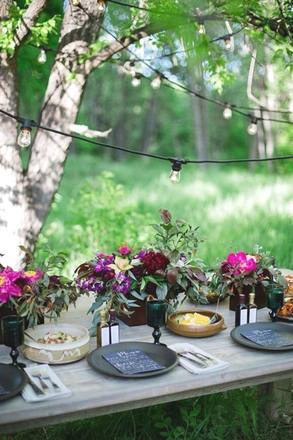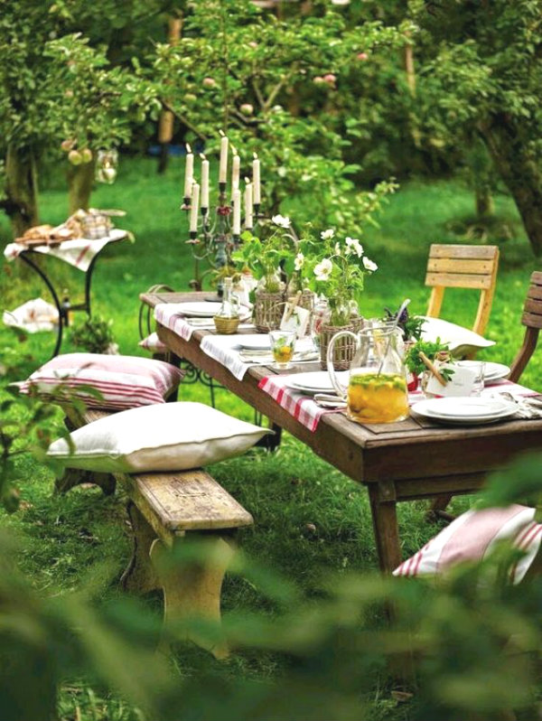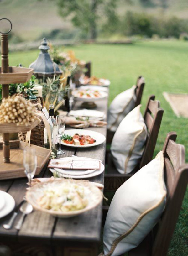 If you have existing outdoor timber furniture, it may be worth a sand down – we don’t want your guests getting those pesky splinters. Whilst a stunning old-world like table set up can look romantically dreamy, the reality it should be comfortable too! Scatter some cushions on benches and seats to soften weathered materials.