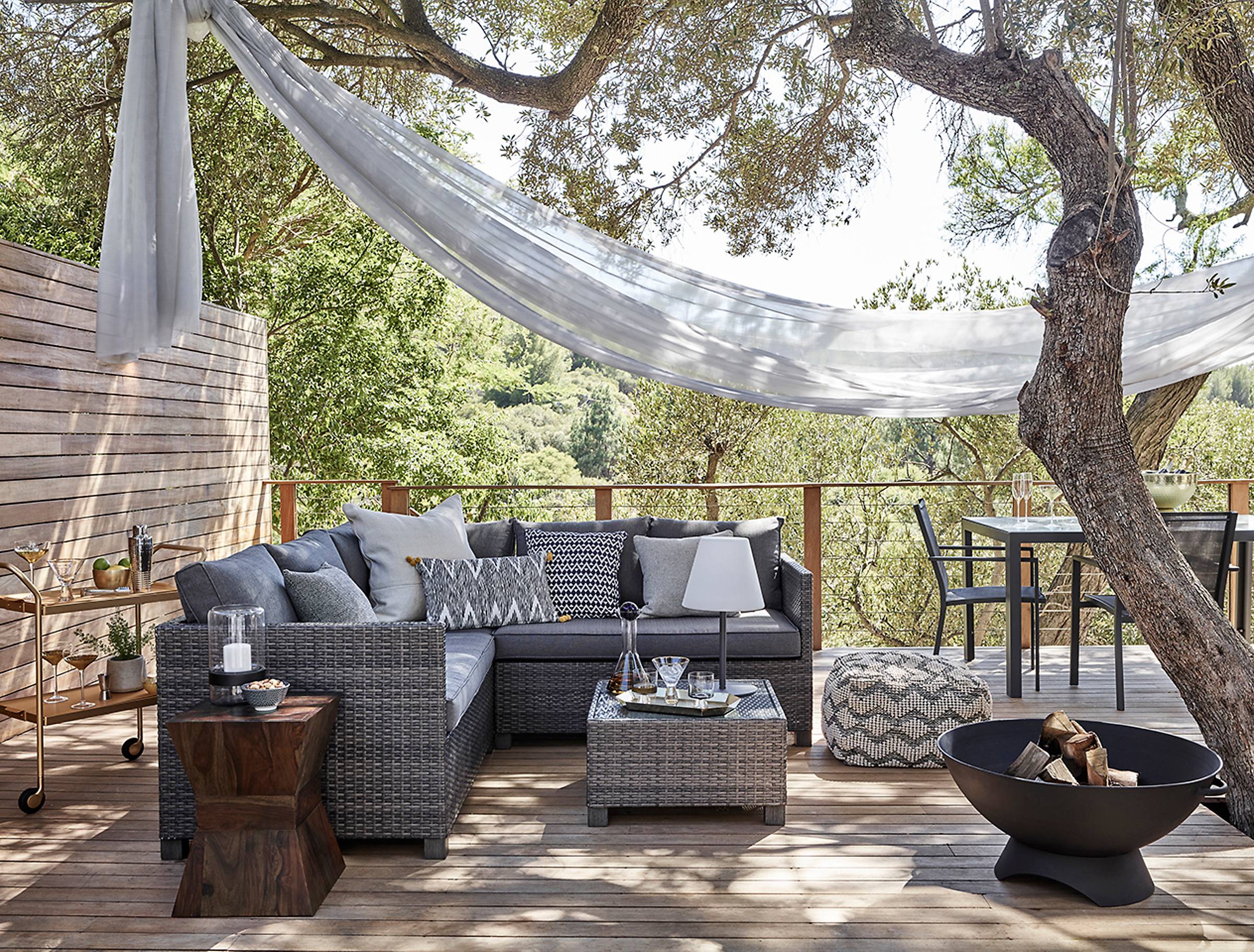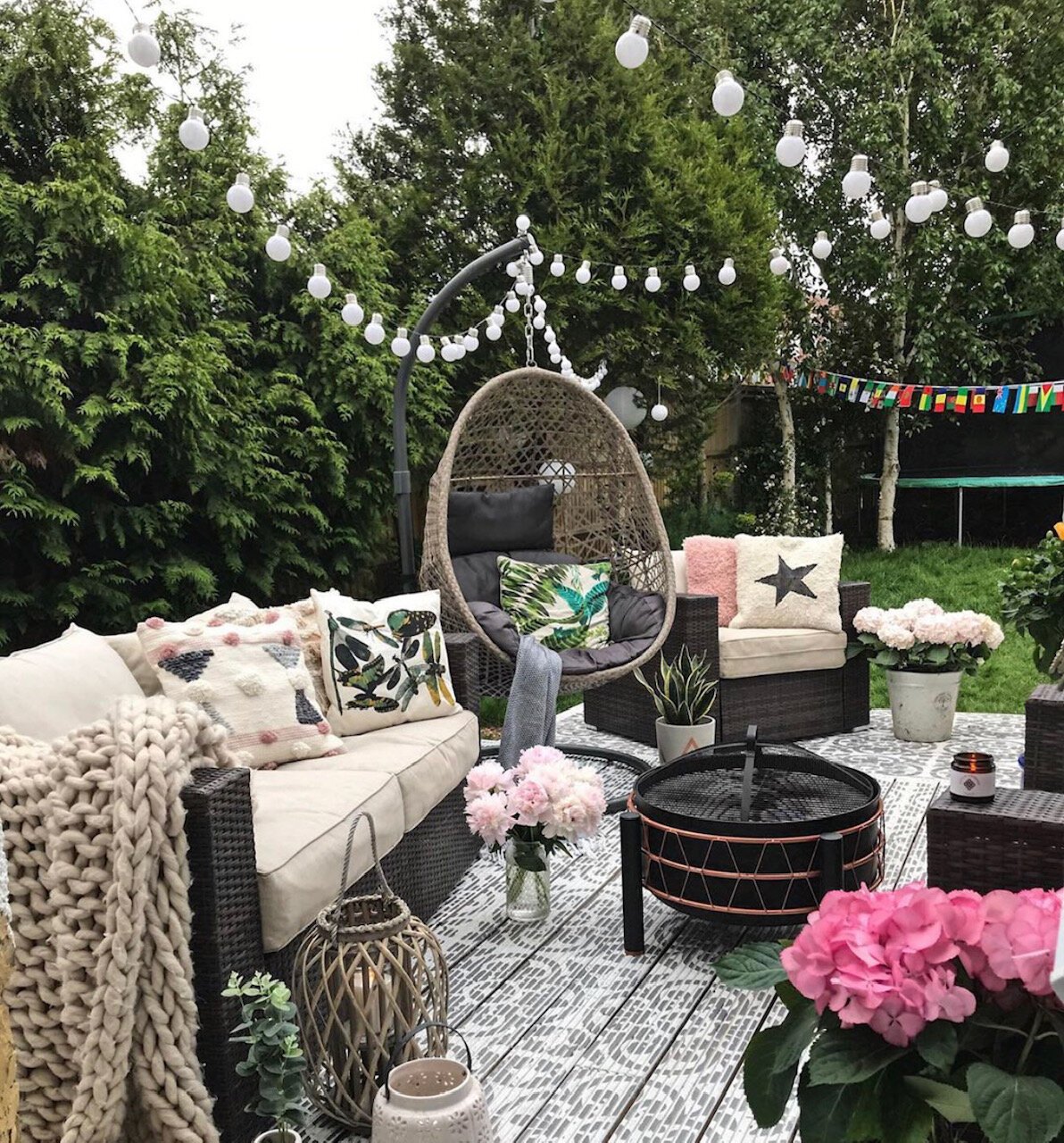 How will you dress your outdoor dining table? Let’s start at the ground up – how about zoning the space with an outdoor rug? The pattern and texture can add an element of quirk and fun. It can be lovely to start with a crisp linen tablecloth as a blank canvas. Add seat cushions to the chairs, there are lots of outdoor cushions you can use but it’s fine to bring some of your indoors cushions outside (as long as you remember to bring them back in!). The long spring/summer evenings can get chilly so put some blankets out for your guests to cosy into as the firepit glows and the stars emerge.