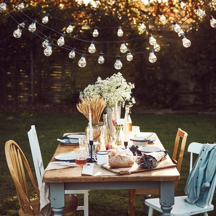 The last thing to add is lighting – this is key. Of course, candles look beautiful to set the scene, especially when set in a stunning candelabra. Or you can add cordless lamps to your dining table. These are a great alternative and can be re-charged at the end of the night. Perhaps you can add a string of lights across your terrace – festoon lighting. To create the ultimate atmosphere, nestle tiki torches into your lawn or flower beds to flicker away as night draws in whilst your guests chat and laugh away in the tranquil ambience you have curated for them. It’s lovely to have low level music in the background, an outdoor speaker is a great investment. Your dinner party can turn into an actual party! Especially if you are celebrating a special occasion. If one of your friends plays the guitar, set a seed in their mind to bring it along. There’s nothing like a good singalong into the stars around a firepit at the end of an evening.