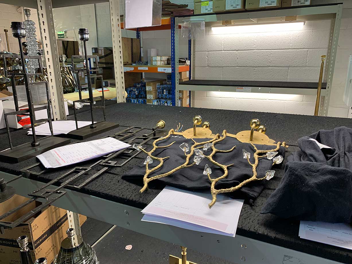 At the Stores department each product received in from each of Porta Romana’s Makers is thoroughly checked by Stores Supervisor Ben Cook and his team. Perhaps there may be a small air bubble in a glass lamp, or a fitting may not be attached correctly – all issues are flagged up before being sent back to the Makers for re-finishing or decommissioning. Each item has its own document outlining the issues making it very clear to the Maker where to re-invest their efforts. It was evident from our experience that the quality control on each and every item that is made by Porta Romana had to meet exacting criteria before being processed onto the Production Manager. Ben then carefully categorises each item. For example, table lamps more often than not are bought in pairs. It is therefore correctly assumed that the lamps should look as identical as possible (we learned out later how extremely challenging this is!). Therefore, Ben would prudently check each lamp design to pair it with a partnering lamp. These lamps are then bagged up and stored together for their future owner. Who would have known such attention to detail, even at this stage, would be required to ensure Porta Romana’s reputation? I certainly didn’t – but I now understand how important each of these processes is to leave us with the end product in our homes.