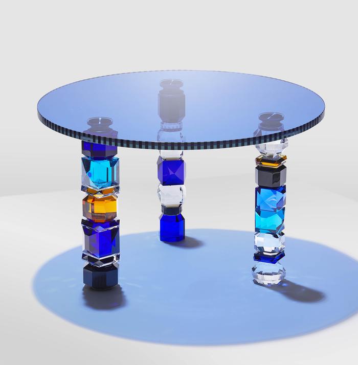 Three colourful geometric shaped legs, each unique in its own right, elegantly meet the blue tabletop with edge engraved stripes.