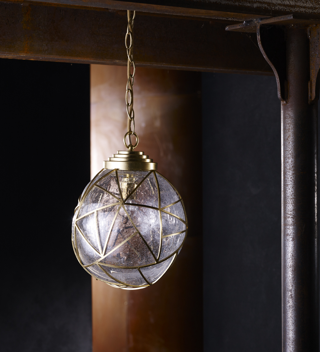 Inspired from the incredible structures woven by insects, a sleeve of clear, bubbled glass sits inside a laser cut trillian framework gilded in precious gold or silver leaf. The meeting of two key elements, fire and earth, combine to create something delicate and beautiful. Suspended as a single pendant, grouped together, or used in combination with the Porta Romana Orb family, the Cocoon is a charming piece which will bring an ethereal beauty to any interior. Available in Bright Gold and Bright Silver.