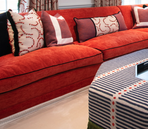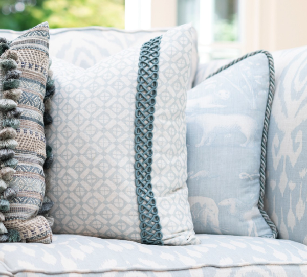 A collection of sophisticated, dimensional, jacquard borders depicting classical greek key borders in an array of strié colours. We coordinated this border on the base of the sofa with the cushion borders which helped tie everything together to achieve that seamless look!
